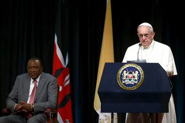 Una danza per far sentire il Papa a casa. Musica africana con gli uomini in camicia bianca e cravatta che ballano a ritmo accogliendo Francesco nell’aeroporto di Nairobi. Il Papa guarda e sorride. Poi 19 chilometri di strada che lo portano nel giardino dello State House di Nairobi per la Cerimonia di benvenuto. Dopo il discorso del presidente del Kenya, Uhuru Kenyatta, Bergoglio parla in inglese. Ringrazia per l’accoglienza. Lui, primo Papa non europeo in Africa. E dice di quanto sia ansioso di essere in mezzo al popolo keniota, «una comunità con ricche diversità, che interpreta un ruolo significativo nella regione. La vostra esperienza nel plasmare una democrazia è condivisa in vari modi da molte altre Nazioni africane. Come il Kenya, anch’esse operano per edificare sulle solide basi del rispetto vicendevole, del dialogo e della cooperazione una società multietnica che sia realmente armoniosa, giusta e inclusiva».