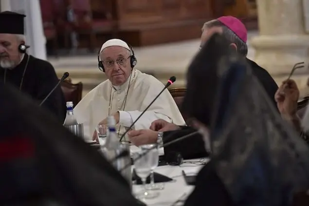 Hanno parlato di profughi e guerre, del ruolo che le Chiese devono avere per ridare speranza ai più deboli e per fare in modo che il Medio Oriente non resti senza cristiani. Un dialogo a porte chiuse al termine del quale papa Francesco ha riassuntoa nome di tutti e parlndo al plurale, il senso dell’incontro: aiutarsi a riscoprire che la presenza dei cristiani in quelle terre sarà tanto più profetica quanto più testimonierà Gesù Principe della pace. Egli non impugna la spada, ma chiede ai suoi di rimetterla nel fodero».