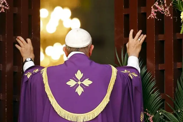 Papa Francesco chiede a tutti di ripetere nella lingua locale le parole amore e pace, per tre volte, prima di varcare la porta e cominciare la messa.