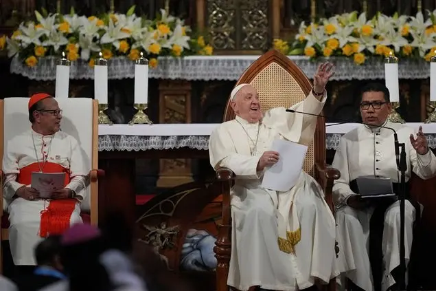 I catechisti sono l’avamposto della Chiesa. Solo dopo vengono «le suorine, i preti, i vescovi». E tutti noi, qui «siamo fratelli, non c’è uno più importante dell’altro, neppure il Papa» Francesco incontra i vescovi, i sacerdoti, i diaconi, i consacrati, le consacrate, i seminaristi e i catechisti indonesiani e comincia a braccio il suo intervento. Chiede quanti catechisti e quanti seminaristi ci sono, poi, sorridendo, ricorda il motto scelto per la visita apostolica: «Fede, fraternità, compassione». Virtù che, dice il Pontefice, «esprimono bene sia il vostro cammino di Chiesa sia la vostra indole di popolo, etnicamente e culturalmente molto varia, ma al tempo stesso caratterizzata da una connaturale tensione all’unità e alla convivenza pacifica, come testimoniano i principi tradizionali della Pancasila».