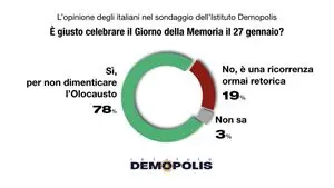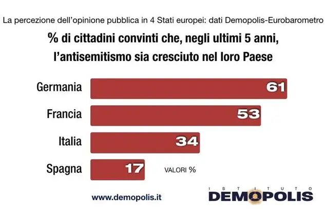 Nella percezione dell’opinione pubblica l’antisemitismo appare in crescita in alcuni dei maggiori Paesi europei: Germania e Francia sono i due Stati più colpiti dal diffondersi del sentimento antisemita. Nel nostro Paese oltre un terzo dei cittadini ritiene che, negli ultimi 5 anni, il sentimento antisemita sia cresciuto. Sono alcuni dei dei dati che emergono da un’indagine realizzata dall’Istituto Demopolis, diretto da Pietro Vento, per il Tg3 e Linea Notte. In un clima sociale nel quale crescono gli episodi di intolleranza, quasi l’80% degli italiani ritiene oggi importante celebrare il 27 gennaio il Giorno della Memoria. Per non dimenticare l’Olocausto, a 75 anni dalla liberazione del campo di Auschwitz da parte delle truppe dell’Armata Rossa. In termini più generali, il 44% degli italiani, intervistati da Demopolis, è convinto che oggi esista una “questione razzismo” nel nostro Paese.