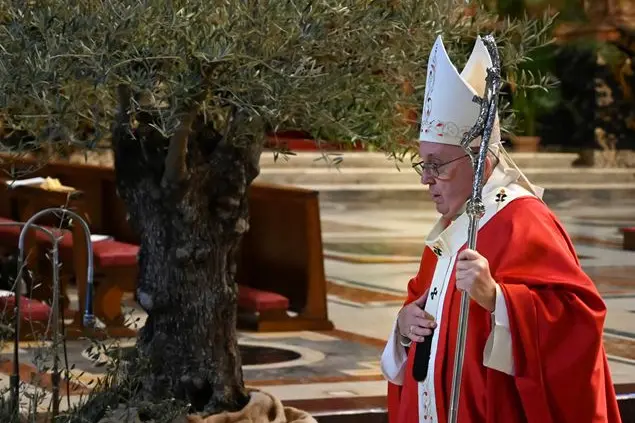 Prima della celebrazione eucaristica, Francesco benedice i pochi rami d’ulivo e di palma allestiti nella Basilica deserta. Poi, con una palma intrecciata, si avvia nel brevissimo tragitto verso l’altare dove al centro c’è il Crocifisso di San Marcello al Corso, dove il Papa era andato a pregare a piedi il 15 marzo scorso e che ha voluto in piazza San Pietro due settimane fa nella liturgia per invocare la fine di questo flagello.