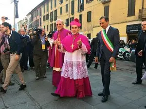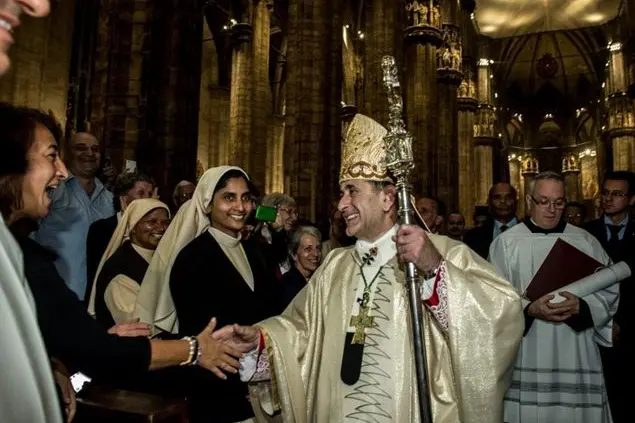 La giornata dell’ingresso a Milano di monsignor Mario Delpini si conclude così, in un Duomo gremito di fedeli, circa seimila, e le autorità in prima fila: il sindaco Sala, il presidente della Regione Lombardia Maroni, il prefetto Luciana Lamorgese. È una cerimonia lunga, solenne, ricca di riti simbolici come si addice a una Chiesa di grande tradizione qual è quella ambrosiana. Alla Messa sono presenti i cardinali Angelo Scola, che consegna il pastorale di San Carlo al suo successore, Francesco Coccopalmerio, Gianfranco Ravasi, Renato Corti, oltre a trenta vescovi provenienti dalle diocesi lombarde e italiane e più di mille sacerdoti.