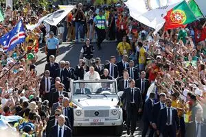 Anche il Papa ha fretto di recarsi all’incontro con i giovani. Arriva in anticipo al Parque Eduardo VII, la grande area di 25 ettari situata nel cuore di Lisbona. Insieme con quella portoghese, che quotidianamente, gigantesca, sventola sul parco ci sono bandiere di tutto il mondo. Ci sono quella cinese e quella turca, oltre alle numerosissime spagnole, italiane, francesi e statunitensi (dagli Usa sono arrivati in circa ventimila).