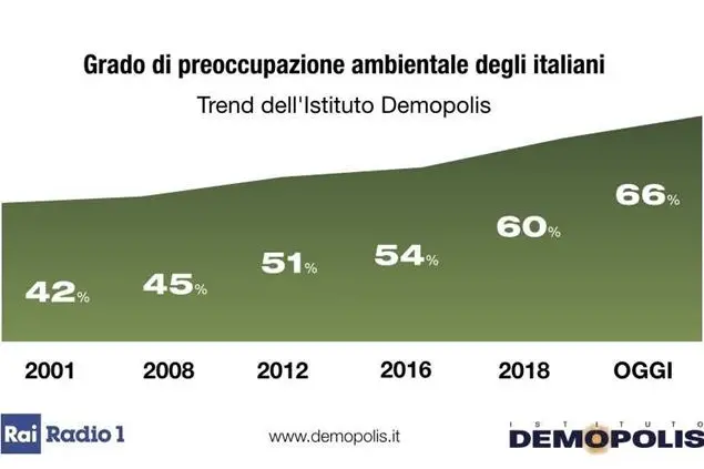 Come conferma il trend storico dell’Istituto di ricerche diretto da Pietro Vento, il grado di preoccupazione ambientale degli italiani è cresciuto di 24 punti negli ultimi 20 anni: era del 42% nel 2001 e raggiunge oggi il 66%, con una crescita molto significativa dell’attenzione negli ultimi anni, determinata dagli eventi di cronaca ma anche, in parte, dal cosiddetto “effetto Greta”.