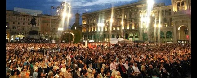 palcoscenico dove ad un certo punto si spalanca la porta centrale del Duomo e il cardinale si inginocchia davanti all'Eucaresti, nel silenzio assoluto dei circa 50 mial che gremiscono la piazza. L'Eucaristia viene raccontata e