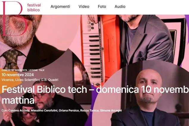 Festival Biblico tech è un progetto speciale reso possibile anche grazie al contributo di numerosi partner e sostenitori. Per questo motivo, il Festival desidera ringraziare in particolar modo Confartigianato Imprese Vicenza, Axera Spa e Armes Spa per il supporto economico, così come il Centro Culturale San Paolo Odv, Informatici Senza Frontiere per l'organizzazione della mostra Sensoltre e l'Apostolato Digitale della Diocesi di Torino per la collaborazione culturale. Il programma Festival Biblico tech è ideato e realizzato in collaborazione con Massimo Cerofolini, giornalista Rai esperto di innovazione, che condurrà la due giorni, mentre Alessio Pomaro, Head of AI di Search On Media Group, farà vivere al pubblico un’esperienza diretta delle ultime innovazioni nel campo dell’intelligenza artificiale. Il Festival Biblico tech si terrà presso il Liceo Quadri di Vicenza. La partecipazione agli eventi è gratuita, ma è consigliata la prenotazione. Informazioni e prenotazioni sono disponibili su www.festivalbiblico.it. Sabato 9 novembre, mattina La prima sessione del Festival inizierà alle ore 9:30 di sabato 9 novembre. L’evento di apertura sarà la lectio Algoretica con padre Paolo Benanti, francescano e docente di etica, bioetica, etica della tecnologia e intelligenza artificiale, nonché esperto di neuroetica e post-umano, che esplorerà il significato e la funzione degli algoritmi, per aprire riflessioni sulle potenzialità, i limiti e i dilemmi etici del mondo dell'intelligenza artificiale. Successivamente, Alessio Pomaro, Head of AI di Search On Media Group, presenterà un’exhibition pratica che mostrerà come l’AI possa interagire con la nostra realtà in modo innovativo e coinvolgente. Alle 10:30, il secondo appuntamento della mattinata sarà il talk Oltre. La spinta dell’uomo tra cielo e infinito, un dialogo a due voci che esplorerà la tensione tra l’ambizione umana e l’infinito. Don Luca Peyron, teologo dell'Università Cattolica e direttore dell'Apostolato Digitale, insieme a Luigi Bignami, geologo e divulgatore scientifico, guideranno il pubblico in una riflessione che si muoverà tra scienza e spiritualità, indagando il desiderio umano di superare i limiti fisici e metafisici. Alle 11:15, Nello Cristianini, professore di intelligenza artificiale presso l'Università di Bath, interverrà in video collegamento per l'intervista Machina sapiens. Le macchine possono pensare?: un’esplorazione di una delle domande più affascinanti e complesse del nostro tempo. Cristianini stimolerà la nostra immaginazione verso nuovi mondi, a partire dalle più recenti scoperte e teorie sull’AI. Subito dopo, alle 11:45, l'incontro Cuore e Codice. La sottile linea tra emozione e algoritmo analizzerà il delicato equilibrio tra emozione e logica. Ernesto Di Iorio, CEO di Quest.it, e padre Tiziano Tosolini, docente presso la Pontificia Università Gregoriana e ricercatore al Nanzan Institute of Religion and Culture in Giappone, discuteranno di come cuore e logica si incrocino nel nostro quotidiano, nella vita delle macchine e nelle scelte morali, per capire se esista un punto d’incontro.