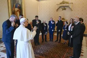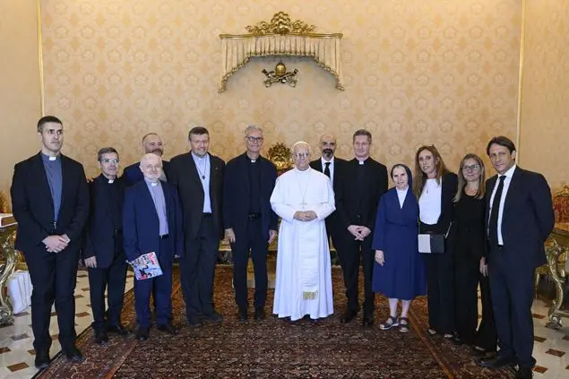 nelle foto (copyright Vatican Media): il Papa mentre dà la sua benedizione e una immagine di gruppo. Da sinistra: don Giuseppe Musardo, don Vincenzo Vitale, don Antonio Rizzolo, don Simone Bruno, don Roberto Ponti, don Stefano Stimamiglio, il Santo Padre, Enrico Intiso, don Giuseppe Lacerenza, suor Anna Luisa Rizzello, Annachiara Valle, Elena Fondrini, Marco Basile
