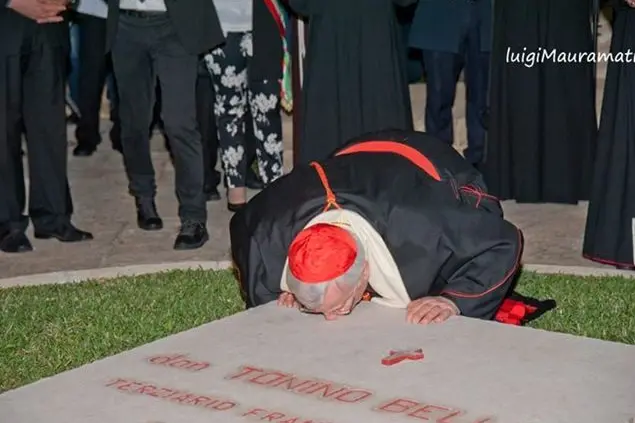 Si inginocchia e bacia la tomba di don Tonino Bello un anno dopo la visita di papa Francesco. Con questo gesto il cardinale Gualtiero Bassetti, arcivescovo di Perugia e presidente della Conferenza episcopale italiana, ha concluso le celebrazioni per il venticinquesimo anniversario della morte del “vescovo degli ultimi”, avvenuta il 20 aprile 1993 a Molfetta, la diocesi di cui era pastore. Invitato dal vescovo della diocesi di Ugento – Santa Maria di Leuca, monsignor Vito Angiuli, il cardinale Bassetti ha prima celebrato la Messa solenne nella Chiesa collegiata del Santissimo Salvatore di Alessano, nel Salento, e poi a piedi, insieme a numerosi fedeli e a monsignor Angiuli si è recato in pellegrinaggio nel piccolo cimitero dove riposano le spoglie mortali di don Tonino: «Se il Signore vorrà», dice Bassetti, «non farà mancare il miracolo per la sua intercessione che lo porterà alla beatificazione. Aggiungo che comunque un miracolo c’è già stato: è la vita stessa di don Tonino che è un esempio per tutti».