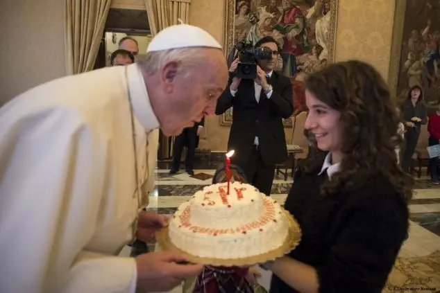 Gli hanno portato una torta e intonato un corale «Auguri papa Francesco!». Così circa sessanta ragazzi dell’Azione Cattolica hanno festeggiato in Vaticano il 79° compleanno del Pontefice che li ha invitati a percorrere la strada del bene, del perdono, della pace e della solidarietà e a dire no al male, alla vendetta, alla guerra e all'egoismo. Il Papa li ha ricevuti per il tradizionale scambio di auguri natalizi con l'allegria e la gioia che sempre riserva ai più piccoli e ha lodato l'impegno dell'Azione Cattolica nel favorire nei ragazzi una conoscenza da vicino del Vangelo stimolando quella missionarietà che a lui sta tanto sta a cuore.