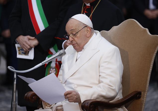 Francesco alza gli occhi al cielo mentre legge il foglio con la preghiera: «Mostraci ancora, o Madre, la via della conversione, perché non c'è pace senza perdono e non c'è perdono senza pentimento. Il mondo cambia se i cuori cambiano; e ognuno deve dire: a partire dal mio».
