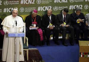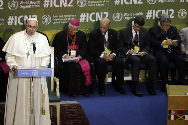 «Lavoriamo per armonizzare le differenze», conclude il Papa, «e uniamo gli sforzi, così non leggeremo più che la sicurezza alimentare per il Nord significa eliminare grassi e favorire il movimento e per il Sud procurarsi almeno un pasto al giorno. Dobbiamo cominciare dalla nostra quotidianità se vogliamo cambiare gli stili di vita, coscienti che i nostri piccoli gesti possono garantire la sostenibilità e il futuro della famiglia umana. E poi continuiamo la lotta alla fame senza secondi fini! Le proiezioni della FAO dicono che entro il 2050, con 9 miliardi di abitanti sul pianeta, la produzione deve aumentare e addirittura raddoppiare. Invece di impressionarci di fronte ai dati, modifichiamo il nostro rapporto con le risorse naturali, l’uso dei terreni, i consumi, eliminiamo lo sperpero: così sconfiggeremo la fame. La Chiesa con le sue istituzioni e le sue iniziative cammina con voi».