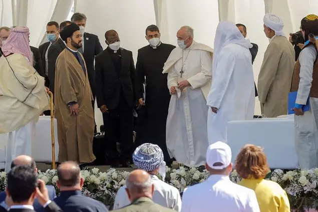 «Molti Paesi, senza coscienza, hanno classificato i nostri passaporti come privi di valore, guardando le nostre ferite con indifferenza. La visita di Sua Santità in Iraq significa che la Mesopotamia è ancora rispettata e apprezzata. La Sua visita significa un trionfo di virtù, è un simbolo di apprezzamento per gli iracheni. Beato chi sradica la paura dalle anime. Beati gli operatori di pace. Santità, ora Lei semina semi d’amore e di felicità. Per la forza del motto della Sua visita – Siete tutti fratelli – dichiaro qui che resterò nella terra dei miei antenati. Sarò sepolta vicino a mio padre: è una mia decisione, per rispetto delle grandi parole: siamo tutti fratelli. Vorrei che lo sentiste nella lingua di Giovanni Battista: enyan bahdady ahe. Siamo per sempre in debito con Sua Santità». È potente la testimonianza di Rafah Husein Baher, una donna sabea mandea che racconta i soprusi subiti dalla popolazione irachena e la possibile convivenza tra fedi diverse. Nella terra di Ur, dove Dio fece sentire la sua voce ad Abramo, si parla in aramaico, in arabo, in inglese, in italiano. «Un incontro storico perché ci si incontra tra religioni», dice lo speaker dando il benvenuto al Papa. Che arriva in ritardo per aver prolungato il suo incontro a Najaf con il Grande Ayatollah Sayyid Ali Al-Husayni Al-Sistani. Un dialogo nel quale Francesco ha ringraziato la massima autorità sciita per gli appelli con i quali, negli scorsi anni, di fronte alla violenza, ha difeso i più deboli e perseguitati, affermando la sacralità della vita umana e l’importanza dell’unità del popolo iracheno.