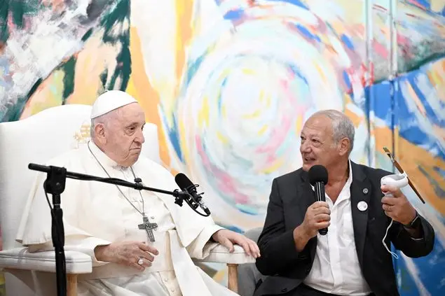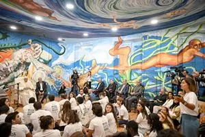 Nella sede di Scholas occurentes per inaugurare il murales più grande al mondo. Papa Francesco parla a braccio, a Cascais, dopo aver ascoltato le parole del presidente Scholas José Maria del Corral e la testimonianza di alcuni giovani. Il murales, tre chilometri e mezoz di colori, è, per Francesco «una cappella Sistina dipinta da voi». Intitolata “Vita tra i mondi”, è stata realizzata da persone di diverse nazionalità: anziani e giovani, ricchi e poveri, bambini e giovani, appartenenti a diverse religioni e non credenti. Francesco ha ricordato loro che le nuove generazioni vivono uno stato di caos e di crisi, ma «una vita senza crisi è asettica, senza sapore, è come l’acqua distillata che non si può bere, è buona solo per essere conservata». Ma le crisi non devono farci girare senza combinare nulla, la «crisi va fatta propria, va accetta, affrontata e risolta»