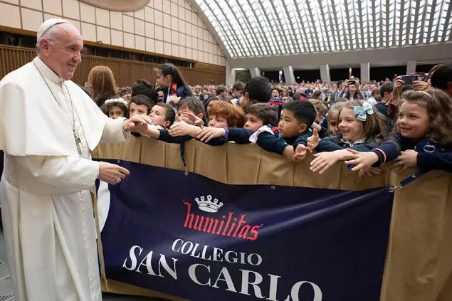 Papa Francesco parla a braccio e dialoga a lungo con gli studenti e i docenti del Collegio San Carlo di Milano ricevuti sabato mattina nell’Aula Paolo VI in occasione dei 150 anni dell’Istituto fondato nel 1869. Oggi è una scuola paritaria cattolica che conta 1.950 studenti di ogni età e 220 insegnanti. Tra i suoi studenti anche Achille Ratti, che diverrà Papa Pio XI. Francesco, rispondendo alle domande di alcuni ragazzi, insegnanti e genitori, tocca vari temi. Anzitutto, rispondendo alla prima domanda, ribadisce che siamo noi «con un sistema economico ingiusto a fare la differenza, a fare che i bambini siano affamati!» e spiega: «Ah, Papa, non sapevo che lei fosse comunista”, qualcuno può dirmi… No! Questo ci ha insegnato Gesù e quando noi andremo lì, davanti Gesù, ci dirà: grazie, perché ero affamato e mi hai dato da mangiare. E a coloro che con questo sistema uccidono di fame i bambini e la gente, dirà: no, tu vattene, perché ero affamato e non mi hai guardato. È buono questo delle differenze, andare a questo protocollo sul quale noi saremo giudicati, Matteo 25. Noi facciamo le differenze». Francesco ricorda inoltre che «sulla coscienza di un popolo che fabbrica le armi e le vende c’è la morte di ogni bambino, di ogni persona, c’è la distruzione delle famiglie». Nel mondo ci sono oltre 900 milioni di mine antiuomo, e quando un povero contadino va a lavorare la terra, morirà o resterà mutilato. Questo non lo ha fatto Dio, «tu l’hai fatto, noi, la mia patria, il mio Paese», sottolinea ancora richiamando l’esperienza di un giovane ingegnere al Sinodo: aveva vinto un concorso per lavorare in una fabbrica dove si facevano anche armi ma non ha voluto mettere le sue mani e la sua intelligenza per fare cose che avrebbero ucciso altre persone.