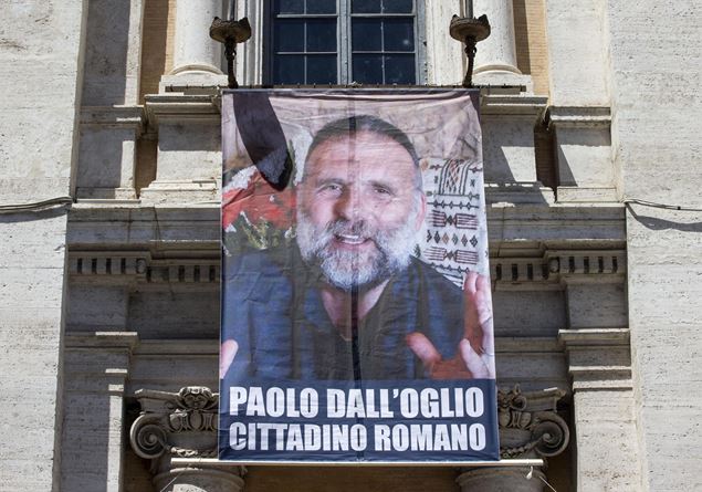 (Nella foto Ansa: la gigantografia di padre Paolo Dall'Oglio esposta al Campidoglio a due anni dal suo rapimento)