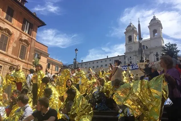 Le barchette color argento luccicano sul pavimento. L’oro delle coperte termiche esposto o indossato richiama l’attenzione. Dopo il flash mob a piazza di Spagna, in pieno centro di Roma, il segno distintivo del primo soccorso ai migranti si sposta sui balconi e sui corpi dei sostenitori della campagna #ioaccolgo. Un cartello di 46 associazioni, dall’Arci alla Caritas a Sant’Egidio, a Intersos, alla Focsiv, per citare solo alcuni degli aderenti, chiedono che non si dimentichi «il dovere della solidarietà iscritto nella nostra Costituzione». All’indomani dell’approvazione del secondo decreto sulla sicurezza, e mentre si misurano ancora le ricadute negative del primo, le associazioni chiamano tutti i cittadini a non indietreggiare nella difesa dei diritti umani.