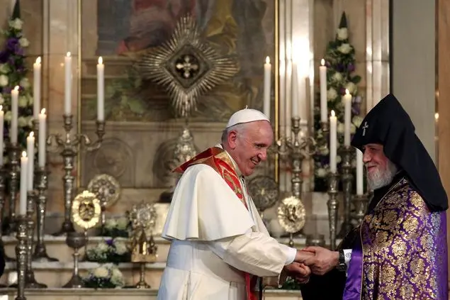 Una terra «messaggera di Cristo fra le nazioni». Così papa Francesco definisce l'Armenia nel suo primo discorso del suo viaggio nel Caucaso. Un nuovo passo nel cammino dell'ecumenismo già tracciato fin dall'elezione di Francesco quando il catholicos Karekin II raccolse l'invito di essere presente a Roma per la messa di insediamento. Il Papa ringrazia la Chiesa e il popolo armeno e visita subito la cattedrale, la Santa Etchmiadzin, dicendo: «mi inchino di fronte alla misericordia del Signore, che ha voluto che l’Armenia diventasse la prima Nazione, fin dall’anno 301, ad accogliere il Cristianesimo quale sua religione, in un tempo nel quale nell’impero romano ancora infuriavano le persecuzioni. La fede in Cristo non è stata per l’Armenia quasi come un abito che si può indossare o togliere a seconda delle circostanze o delle convenienze, ma una realtà costitutiva della sua stessa identità, un dono di enorme portata da accogliere con gioia e da custodire con impegno e fortezza, a costo della stessa vita». Ricorda le parole di Giovanni Paolo II che, nella lettera apostolica per il 1700° anniversario del «"Battesimo" della comunità armena», battesimo con il quale «nasce un’identità nuova del popolo, che diverrà parte costitutiva e inseparabile dello stesso essere armeno. Non sarà più possibile da allora pensare che, tra le componenti di tale identità, non figuri la fede in Cristo, come costitutivo essenziale» e benedice «per questa luminosa testimonianza di fede, che dimostra in modo esemplare la potente efficacia e fecondità del Battesimo ricevuto più di millesettecento anni fa con il segno eloquente e santo del martirio, che è rimasto un elemento costante della storia del vostro popolo».