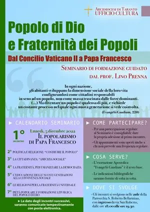 Un seminario di formazione sulla fraternità con sette incontri sul tema “Popolo di Dio e Fraternità dei popoli”. È il cammino proposto dall’Ufficio Cultura dell’arcidiocesi di Taranto.