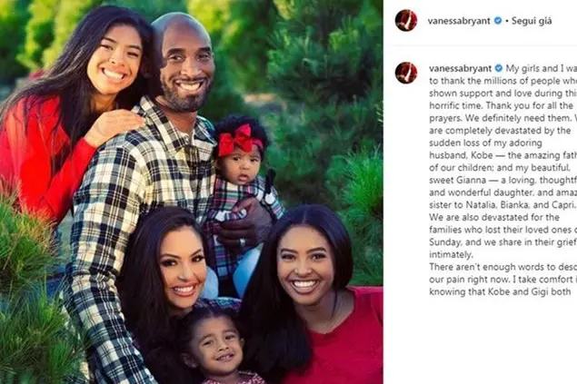 «Io e le mie figlie siamo completamente devastate dall'improvvisa perdita di mio marito Kobe - il meraviglioso padre dei nostri figli - e della mia bella e dolce Gianna - una figlia amorevole, generosa e una meravigliosa sorella per Natalia, Bianka e Capri», ha scritto ieri sera Vanessa Bryant sul suo account Instagram. «Siamo devastate per le famiglie che hanno perso i loro cari domenica e condividiamo il loro dolore. Non ci sono parole per descrivere la nostra sofferenza in questo momento», ha scritto Vanessa ringraziando «milioni di persone che hanno dimostrato il loro sostegno e amore per noi in questo calvario». Dicono gli amici che Vanessa non riesce a finire una frase senza piangere. La 37enne, spiega chi le sta vicino, è circondata da «un buon sistema di assistenza, da persone che la amano e amavano Kobe», ma «non puoi mai essere preparata ad una cosa del genere». Vanessa sta lavorando molto duramente per mantenere il controllo per le altre ragazze. Ora deve essere forte». Lei e Kobe erano anime gemelle. Si erano sposati nel 2001, quando lei aveva solo 18 anni e lui 22. Intanto emergono alcuni particolari sull’incidente. Solo le impronte digitali hanno permesso di identificare ufficialmente Kobe Bryant. Dopo un lungo lavoro l'ufficio del medico legale della contea di Los Angeles ha comunicato di aver riconosciuto i resti del campione, oltre a quelli di due uomini e una donna: John Altobelli (il 56 enne allenatore di baseball deceduto con la moglie Keri e la figlia Alyssa), il pilota Ara Zobayan, 50 anni, e Sarah Chester, 46 anni. Rimangono da identificare le altre vittime, tra cui la tredicenne Gianna. Secondo il sito Tmz non è stata presa ancora nessuna decisione sul funerale del cestista, mentre sono in corso discussioni sulla cerimonia pubblica in suo ricordo, che potrebbe tenersi nelle prossime settimane o mesi al maxi-stadio Los Angeles Memorial Coliseum perchè lo Staples Center, la casa dei Lakers, non è abbastanza grande. Lo Staples Center ospita infatti 'solò 20 mila persone, mentre il Coliseum ha una capienza di 80 mila, senza contare i parchi circostanti. Visto l'enorme tributo che gli è stato riservato finora - scrive Tmz - sembra l'opzione più logica. Tra gli ultimi ricordi del campione c'è quello dell'ex compagno di squadra Shaquille ÒNeal: «Non sentivo un dolore così forte da un po', se ne è andato il migliore Lakers del mondo». Continuano le indagini sulle cause dello schianto. La National Transportation Safety Board ha fatto sapere che l'elicottero su cui viaggiava Kobe non era dotato del sistema di avviso e rappresentazione sul terreno (Taws), che avrebbe potuto fornire al pilota informazioni fondamentali sull'area montuosa dove il mezzo si è schiantato. Gli esperti del settore hanno spiegato che il sistema può inviare un segnale acustico di avvertimento almeno dieci secondi prima di una potenziale collisione con il terreno. Ed è forse il selfie sfuocato di un giovane fan l'ultima immagine del campione. Bryant ha trascorso il giorno prima dell'incidente alla Mamba Sports Academy, l'accademia di basket che ha fondato nel 2018, e ad un certo punto, come racconta il New York Times, il 13enne Brady Smigiel ha scattato un selfie con lui e due compagni di squadra.