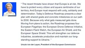 L’Europa si prepara alla guerra moderna. La Commissione Europea ha presentato a Bruxelles la sua “roadmap 2030 per la pace e la preparazione alla difesa”, un piano che segna un cambio di passo nella politica di sicurezza comune: quattro grandi progetti per rendere il continente più autonomo nella difesa, in risposta alla minaccia russa e alla crescente pressione geopolitica. «Le recenti minacce hanno mostrato che l’Europa è in pericolo. Dobbiamo proteggere ogni cittadino e ogni centimetro del nostro territorio», ha dichiarato Ursula von der Leyen, presidente della Commissione. Un messaggio forte, che risuona come un avvertimento: l’era dell’ingenuità europea sembra finita.