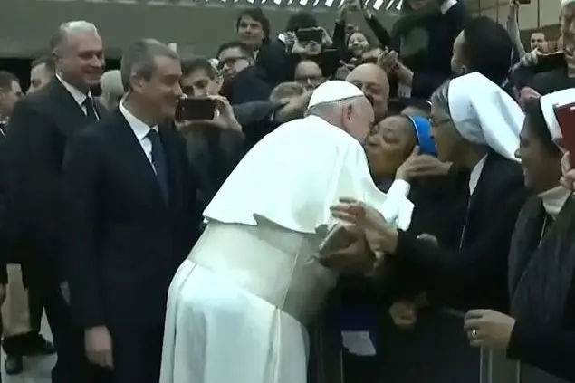 Ironia, autoironia e tanto humor. Mercoledì 8 gennaio papa Francesco ha confermato di che pasta è fatto, a partire dalla capacità di comunicare. Un paio di siparietti non sono passati inosservati. Mentre percorreva la corsia centrale della Sala Nervi per salutare i fedeli, stringendo le mani e dispensando sorrisi e benedizioni, Bergoglio si è fermato davanti a una suora africana che animatamente gridava: «Viva il Papa!» e le ha detto, con tono scherzoso: «Tu mordi! Io ti do il bacio ma tu stai tranquilla... Non mordere!». Poi l'ha baciata e ha proseguito il suo cammino. Al termine dell'udienza, poi, nei saluti finali ha fatto il bis: «Saluto la delegazione del Comune di Asti...sono bravi, questi di Asti: hanno portato la bagna càuda! (una salsa tipica piemontese in cui vanno intinte verdure crude di diverso genere, ndr.)»
