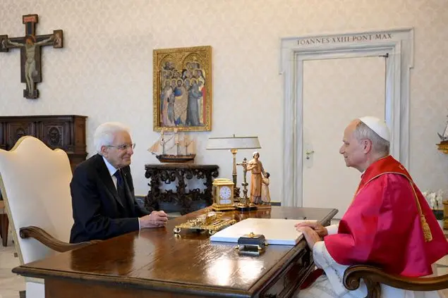 Due ore in tutto. La visita ufficiale del presidente della Repubblica Sergio Mattarella, la prima al nuovo Papa, ha visto anche un colloquio privato di circa 40 minuti. Un faccia a faccia nella Biblioteca privata che si è svolto a porte chiuse. E durante il quale, fa sapere una nota della Santa Sede si sono toccati «diversi temi». Nel successivo colloquio con il segretario di Stato Pietro Parolin, si è parlato, invece, «dei cordiali rapporti tra i due Stati» e delle crisi mondiali con «particolare attenzione ai conflitti in corso in Ucraina e in Medio Oriente». Leone XIV, mozzetta rossa e stola, ha accolto il presidente della Repubblica poco prima delle 9. Mattarella, che era accompagnato dai tre figli con i rispettivi coniugi e dai cinque nipoti, ha regalato al Pontefice un volume del '500 di scritti di Sant’Agostino mentre il Papa ha donato un medaglione in bronzo e due libri, uno con la riproduzione di opere d'arte conservate nel Palazzo Apostolico, l'altro con il messaggio di Papa Francesco per la Giornata della Pace 2025. Il Presidente ha ricordato il suo affetto per papa Francesco e la sua toccante visita alla tomba del Papa scomparso.