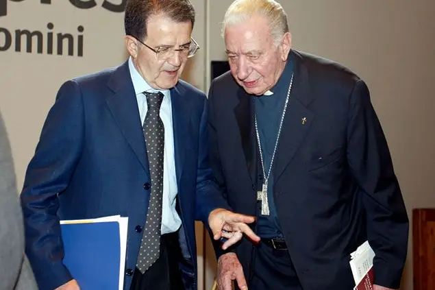 (Foto Ansa: monsignor Antonio Riboldi con Romano Prodi a Bologna nel 2003)