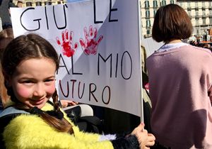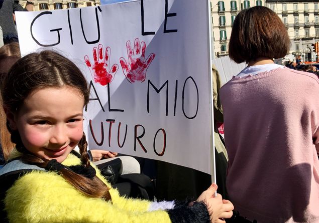 Così a casa mentre disegnavano il contorno delle proprie mani sul cartoncino bianco da portare in piazza, Daniela spiegava a sua figlia che cosa fossero il cambiamento climatico, il buco dell’ozono, l’effetto serra e il surriscaldamento del pianeta. Lo ha fatto con esempi e termini semplici e alla fine Sara, lasciando sprofondare il faccino nelle spalle e utilizzando appena un filo di voce ha detto: «Stanno inquinando tutto, la terra si sta seccando, gli alberi non ci fanno respirare più». Daniela con una voce più forte ribadisce ciò che Sara ha pronunciato timidamente. «Con parole semplici di bambina ha capito il senso della mobilitazione globale e il perché della manifestazione». Dice guardando Sara che con le manine si fa ombra sul viso, si protegge da un sole che al Sud, nel mese di marzo, regala già temperature estive. «Avremmo dovuto mettere la crema solare che protegge dai raggi ultravioletti».