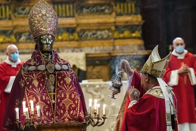 Quello del 16 dicembre è il meno noto dei tre “miracoli” ma secondo la tradizione, se non avviene, è comunque un brutto segno. Stamattina il sangue di San Gennaro non si è sciolto: «Quando abbiamo preso la teca dalla cassaforte il sangue era solido e rimane assolutamente solido. Rivolgiamo la nostra preghiera a Dio perché dia forza e coraggio al nostro popolo per affrontare i momenti di questa pandemia che sta costringendo tutti a ripensare la propria vita e che sta causando molti problemi soprattutto ai più deboli e ai più fragili, e ai morti in solitudine che sono il dramma più grande», ha detto monsignor Vincenzo De Gregorio, abate della Cappella del Tesoro, al termine della celebrazione eucaristica quando gli è stata portata la teca che contiene l'ampolla con il sangue di San Gennaro non ancora sciolto.