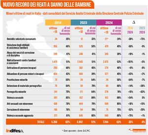 Per la prima volta in Italia i reati commessi ai danni di minori hanno superato la soglia dei 7.000 casi. Nel 2024 sono stati 7.204, con un incremento del 4% rispetto all’anno precedente e del 35% rispetto a dieci anni fa. È quanto emerge dai dati del Servizio Analisi Criminale della Direzione Centrale della Polizia Criminale, diffusi dalla Fondazione Terre des Hommes in occasione della presentazione del dossier indifesa – La condizione delle bambine e delle ragazze nel mondo 2025, alla presenza del ministro per lo Sport e i Giovani Andrea Abodi.
