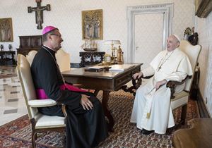 (Foto Ansa: monsignor Visvaldas Kulbokas, nunzio apostolico in Ucraina, in un incontro con papa Francesco nel 2021)