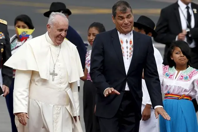 E' all'areoporto internazionale Mariscal Sucre che papa Francesco pronuncia il suo primo discorso del lungo viaggio in America Latina. Ad attenderlo il presidente dell'Ecuador, Rafael Correa al centro, nei giorni scorsi, di una fortissima protesta arrivata fin sotto la sede del Governo. Proprio ieri la Conferenza episcopale ecuadoriana è dovuta intervenire, per la quinta volta in modo ufficiale, per sollecitare tutte le parti a non politicizzare la visita del Papa. Bergoglio, recita l'ultimo comunicato stampa, «non viene per consacrare alcuna ideologia o regime politico, bensì per annunciare Gesù. Non è il momento di manifestare idee o progetti politici, né di costruire polemiche o divisioni».