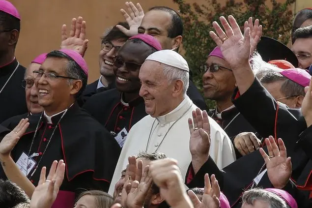 E, dopo i ringraziamenti del cardinale Lorenzo Baldisseri, segretario generale del Sinodo, il Papa parla a braccio per dire che il Sinodo non è un Parlamento, ma uno spazio dove parla lo Spirito «per questo vengono date solo le informazioni generali e non chi ha detto quella frase o quell’altra, perché è lo Spirito che ha lavorato». In secondo luogo, Francesco chiede di ricordare che «i primi destinatari del documento finale siamo noi stessi, io per primo». Soprattutto, però, ribadisce che la Chiesa va difesa sempre e comunque. «Penso a nostra Madre, la Santa madre Chiesa», dice ricordando gli ultimi tre numeri del documento che riguardano la santità. «La Madre è santa, ma noi figli siamo peccatori», dice riferendosi agli ultimi attacchi e alle polemiche scatenate sul tema degli abusi. «Siamo peccatori tutti», ribadisce, «non dimenticate la definizione dei padri, “la casta meretrix”, la Chiesa santa con i figli peccatori. E a causa dei nostri peccati c’è sempre il grande accusatore che approfitta, che gira gira cercando chi accusare». «In questo momento», conclude, «ci sta accusando forte e questa accusa diventa persecuzione pure». Non solo una persecuzione dei cristiani come avviene in Medio Oriente e come ha ricordato il cardinale Sako chiedendo di non lasciare soli i cristiani in quelle terre, «ma anche un altro tipo di persecuzione: una accusa continua per sporcare la Chiesa. E la Chiesa non va sporcata, questo è il momento di difendere la Madre e la Madre la si difende dal grande accusatore con la preghiera e la penitenza». Francesco ricorda che proprio per questo ha chiesto di pregare con il rosario perché Maria protegga la Chiesa e ribadisce ancora: «È un momento difficile perché l’accusatore tramite noi attacca la Madre e la Madre non la si tocca». «la Chiesa non va sporcata,è il momento di difendere la Madre»