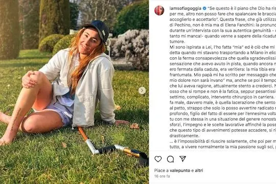 Nei giorni immediatamente successivi all’ennesima caduta, all’ennesimo grave infortunio – sfortunato proprio perché occorso durante un allenamento senza particolari rischi intrinseci – Sofia aveva pubblicato la foto tenerissima di un abbraccio con papà Ezio, ingegnere con una vocazione artistica, con cui si sa che c’è un legame forte. Stavolta è un post su Instagram, la prima vera “uscita” pubblica in un periodo psicologicamente certo non facile, spiega il senso di quell’abbraccio che allora parlava solo con l’immagine: «Se questo è il piano che Dio ha riservato per me, altro non posso fare che spalancare le braccia, accoglierlo e accettarlo». Ha esordito Sofia, accanto a una foto forse forzatamente sorridente con sutura e stampelle in vista, spiegando: «Questa frase, che già utilizzai prima di Pechino, non è mia ma di Elena Fanchini: la pronunciò durante un’intervista con la sua autentica genuinità - che tanto mi manca!- quando venne a sapere della ricaduta del tumore».