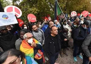 Il riferimento all’assalto alla Cgil e alla guerriglia urbana di sabato, che a Roma ha saldato anti green pass ed estrema destra, ha dato a questa sessantesima marcia un’urgenza in più, una concretezza di carne e sangue che rende tutto molto vicino e meno astratto. Lungo la strada verso la partenza fissata ai Giardini del Frontone, la piccola Ipazia dorme beata nella sua tutina antifreddo rosa confetto. Attaccata al suo passeggino c’è una piccola bandiera di carta con i colori dell’iride, una didascalia spiega: la mia prima marcia della pace. Ho 151 giorni. È ignara, non sa, non potrà ricordare, ma i suoi genitori erano già qui due anni fa e sono tornati perché è a lei che vorrebbero dare un mondo più sano in cui vivere domani, quando le mostreranno questa foto e quando sarà abbastanza cresciuta nei valori che sperano di trasmetterle.