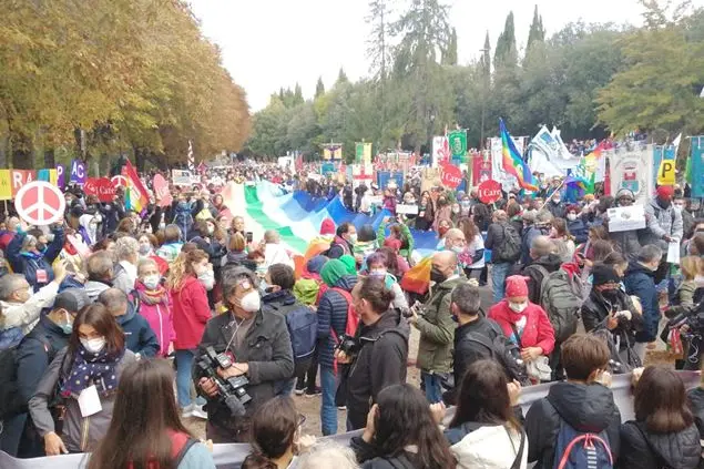 È un popolo variegato e colorato quello della Marcia Perugia – Assisi, non solo per l’arcobaleno che come in un caleidoscopio si propaga dalla grande bandiera alla testa del corteo alle mille variazioni sul tema che rimbalzano dalle bandiere sulle spalle, alle mascherine e persino a una gran cassa e alla chioma di una signora, non più ragazza, che si è tinta i capelli arcobaleno perché il messaggio sia più chiaro. In un gruppo di Bergamo una ragazza spiega che si viene per l’esperienza, per condividere dei valori anche se magari le motivazioni individuali sono diverse: muove il passaparola, l’invito di un amico, la curiosità di esserci. Ci si arriva a volte scoprendo l’occasione un po’ per caso: «Non conoscevamo la marcia», racconta Tommaso studente di Scienze motorie a Torino: «l’abbiamo scoperta da un sito Internet ci è piaciuta l’idea e siamo venuti in gruppo. Speriamo di arrivare in fondo, una notte in pullman da Cuneo - scherza - non è proprio il massimo come preparazione atletica».