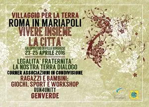 Da un Giubileo all’altro: nel 2000 Chiara Lubich, fondatrice del movimento dei Focolari, aveva ricevuto la cittadinanza onoraria della Capitale impegnandosi a nome di tutta la comunità a lavorare di più e meglio per la città di Roma. E nel cuore dell’Anno santo dedicato alla misericordia da papa Francesco, si svolge a Villa Borghese, presso il Galoppatoio, una manifestazione dal titolo “Villaggio per la Terra. Vivere insieme la città. Roma in Mariapoli”, evento promosso da Earth Day Italia e dal movimento dei Focolari di Roma. Che spiegano di aver voluto allestire «una città temporanea dentro la città per riscoprire insieme, impegnandosi a costruire ponti di dialogo, conoscenza reciproca e accoglienza, quella vocazione alla fraternità universale che la rende Roma unica al mondo».