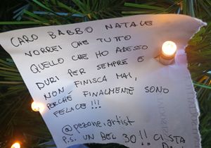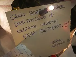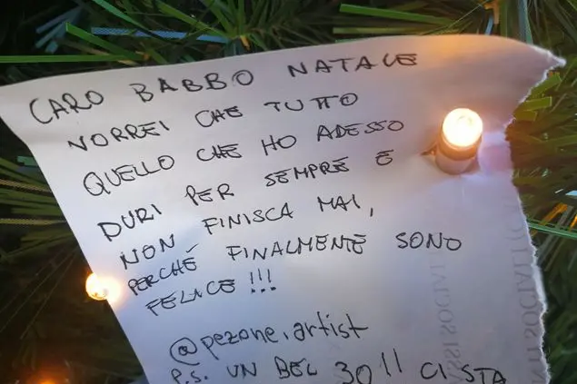Debora e Valerio vorrebbero che «smettessero le guerre». Una persona che si firma con le iniziali, L.I., chiede la «felicità per i meritevoli, di aiutare mia madre a guarire e Daniela con la tesi magistrale. Aiutami a trovare il mio angolo di paradiso in questa vita d’inferno. E il sorriso sul volto di ogni bambino». Giulia chiede tante cose: «riprendermi da questo brutto periodo, che mio padre sia più felice e fiero di me nonostante i miei sbagli. Vorrei riuscire ad andare all’Accademia di Belle Arti. Mi sto innamorando di un ragazzo e vorrei ricambiasse, essere felici insieme. Infine, vorrei non perdere mai le gioie della vita: Antonio, Brio, Federica, Giovy». Un anonimo chiede di «incontrare gli occhi di Alessandra che sono l’unica strada per la felicità del mio cuore di cui lei possiede ancora le chiavi». Giulia e Marianna si rivolgono a Gesù Bambino: «Vorremmo che questo fosse l’ultimo giorno di lavoro a Roma. Ti prego, fa che io e la mia collega torniamo a casa dai nostri cari. Illumina le menti di chi ci governa. Ti prego ascolta la nostra preghiera».