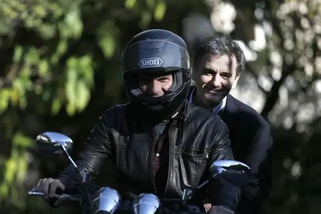 Nella foto: il ministro dell'Economia uscente Yanis Varoufakis con Euclid Tsakalotos (senza casco)