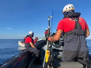 Il mare e poco mosso e fa caldo. A poca distanza da noi naviga il secondo Rhib della Life Support, più piccolo. Lo guida Elena Buch, 43 anni, spagnola della Galizia, alla sua prima missione con Emergency, ma una lunga esperienza con questi veloci gommoni perché ha lavorato su una nave ospedale. Il boat leader è Florent Cruciani, 33 anni, francese di Marsiglia. Ha già partecipato a quattro missioni della Life Support e a sette operazioni di salvataggio. L’altro soccorritore è Chris Fusco, 31 anni, romagnolo di Forlì, alla sua dodicesima missione con la Life Support. Sono ragazzi alti, atletici e muscolosi che, nei tempi morti, si tengono allenati, anche con un sacco da boxe. Portare i naufraghi a bordo richiede muscoli forti. Altre persone a bordo della Life Support salgono a bordo del secondo gommone e si fingono naufraghi che dobbiamo soccorrere. Quando ci avviciniamo a loro, Chiara si alza in piedi e li rassicura in inglese: “Siamo europei, non preoccupatevi, vi portiamo in Italia”. Se necessario può ripeterlo in arabo e in francese. Il primo obiettivo è rassicurare le persone, stremate dai giorni passati in mare, terrorizzate all’idea di tornare in Libia o in Tunisia.