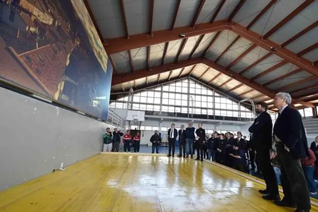 (Foto Ansa: l'inaugurazione del nuovo cinema nel Palazzetto dello sport di Amatrice)