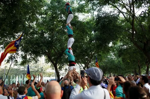 (Foto Reuters: qui sopra, un gruppo di "castellers" compone la torre umana detta "castell", una delle tradizioni più popolari e spettacolari della Catalogna, durante una manifestazione a Barcellona. In copertina: manifestanti a sostegno del referendum del 1° ottobre)