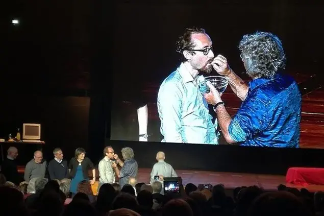 Al termine della prima serata del suo nuovo spettacolo “Grillo vs Grillo”, al Lingotto di Torino, Grillo ha chiamato sul palco i politici piemontesi del suo movimento per inscenare una sorta di “comunione”. In mano dei grilli secchi e la frase per ognuno: “Questo è il mio corpo”.