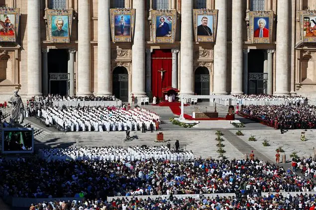 Il segreto della preghiera è tutto qui: «Gridare, non stancarsi, e, se ti stanchi, chiedere aiuto per tenere le mani alzate. Questa è la preghiera che Gesù ci ha rivelato e ci ha donato nello Spirito Santo. Pregare non è rifugiarsi in un mondo ideale, non è evadere in una falsa quiete egoistica. Al contrario, pregare è lottare, e lasciare che anche lo Spirito Santo preghi in noi. E’ lo Spirito Santo che ci insegna a pregare, che ci guida nella preghiera, che ci fa pregare come figli. I santi sono uomini e donne che entrano fino in fondo nel mistero della preghiera. Uomini e donne che lottano con la preghiera, lasciando pregare e lottare in loro lo Spirito Santo; lottano fino alla fine, con tutte le loro forze, e vincono, ma non da soli: il Signore vince in loro e con loro. Anche questi sette testimoni che oggi sono stati canonizzati, hanno combattuto la buona battaglia della fede e dell’amore con la preghiera. Per questo sono rimasti saldi nella fede, con il cuore generoso e fedele».