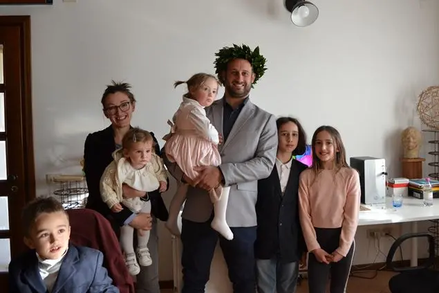 La corona d’alloro ce l’aveva, sulla testa, come ogni laureato d’Italia che esce dall’università sprizzando gioia per la chiusura di un ciclo e l’avere tutta la vita davanti. Paolo Berdusco la vita e la gioia le ha portate direttamente con sé, il giorno in cui si è laureato, a marzo, presso l’Istituto Superiore di Scienze religiose “Giovanni Paolo I” di Belluno. L’emozione resta immortalata in una foto con la moglie Chiara e i cinque figli, una bella squadra composta da Filippo, Maddalena, Giovanni, Benedetta, fino alla piccola Agnese, che certamente non coglie la portata del traguardo di suo papà, che mentre lavorava e li accudiva ha studiato e scritto una tesi in Scienze religiose dedicata a “La famiglia nella società post-familiare. Rilievi antropologici”.