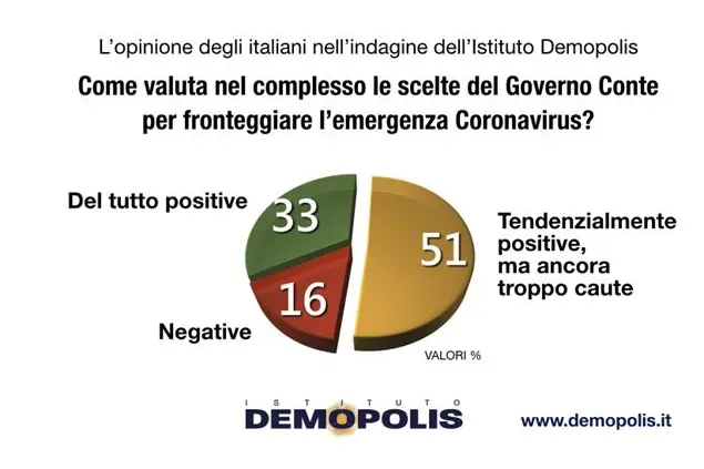 Promosse alla grande dagli italiani le misure adottate dal Governo Conte per fronteggiare l’epidemia di coronavirus. E’ quanto sembrano dirci i numeri del sondaggio realizzato dall’Istituto Nazionale di Ricerche Demopolis (per il programma televisivo Otto e Mezzo di La7). Infatti, sommando il 33% che ritiene “del tutto positive” le scelte operate finora, e il 51% che le ritiene “tendenzialmente positive, ma ancora troppo caute”, emerge che più di otto italiani su dieci approvano l’operato del governo Conte in questa emergenza. Solo il restante 16% esprime un giudizio “negativo”.