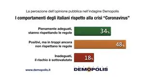 Se il governo esce promosso, non altrettanto benevolo è il giudizio sui connazionali, troppo spesso non osservanti le nuove norme anti-epidemia. Lo dice la sezione del sondaggio riguardante i “comportamenti degli italiani rispetto alla crisi coronavirus”. Rispetto all’invito a stare a casa, poco più di un terzo afferma che i comportamenti siano pienamente adeguati. Il 48%, quasi un cittadino su due intervistato da Demopolis, sostiene che la risposta degli italiani sia positiva, ma che “in troppi ancora non stiano rispettando le regole”; il 18%, invece, considera “i comportamenti inadeguati, ritenendo che molti italiani stiano sottovalutando i rischi”.