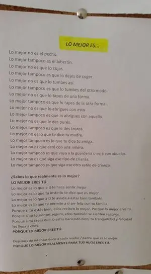 Un decalogo? Una Poesia? Difficile definire questo testo che pare sia apparso sullo porta di un pediatra ed è frutto di una mamma bolgger spagnola di nome Jaione. Una cui, quando ha avuto il suo bambino, probabilmente tutti dicevano cosa fare….
