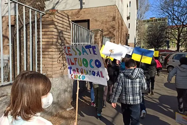 Cessate il fuoco, torniamo al gioco. È uno degli slogan lanciato dai bambini della scuola Crispi di Milano che nei giorni scorsi hanno attraversato il quartiere, in zona Viale Monza, per esprimere tante preoccupazioni e un unico desiderio: la pace. Perché la guerra in Ucraina non ha lasciato indifferenti nemmeno loro, i piccoli della primaria. «Fra i nostri alunni ci sono bambini le cui famiglie sono originarie di Russia e Ucraina», dice la docente Mariacristina Mecenero. «Quando è scoppiato il conflitto ne abbiamo subito parlato in classe: i bambini erano allarmati, anche chi ha genitori italiani: temevano la Terza guerra mondiale».